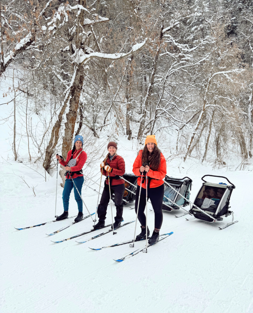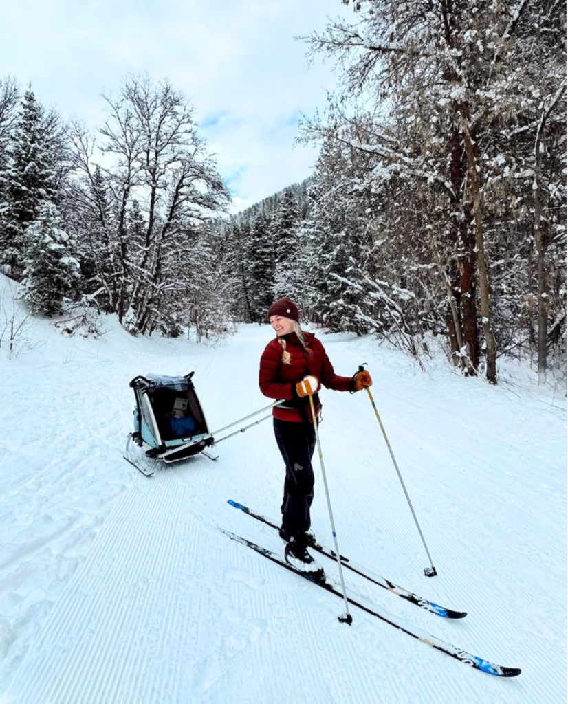 To bring littles along, I’d recommend using the Thule chariot trailer/stroller. We snagged the cross country skiing kit, which converts your stroller into a pull behind skiing sled.